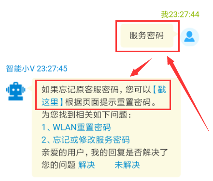 点击导航栏右侧“我的”,在该页面中选中“在线客服”,向“智能客服”发送关键词“服务密码”,然后选中回复消息中的“戳这里”字样,即可根据页面提示重置服务密码。