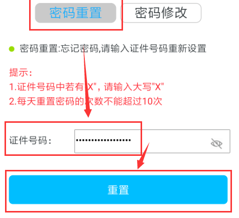 在“密码变更”页面中选择“密码重置”,然后在页面下方输入本号码实名的身份证号码,然后点击下方的“重置”按钮。