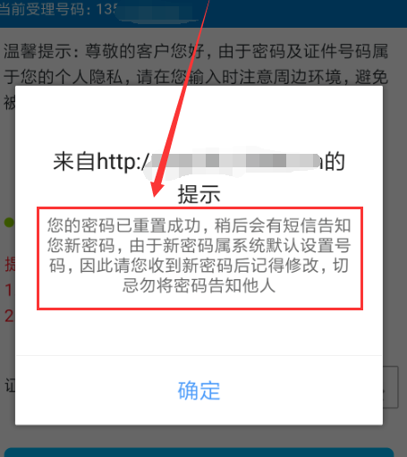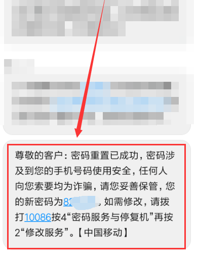 重置服务密码成功后,页面会弹出重置成功的系统提示,同时该手机号码也会受到包含新服务密码的短信,如图所示,我们还可以根据短信提示修改服务密码。